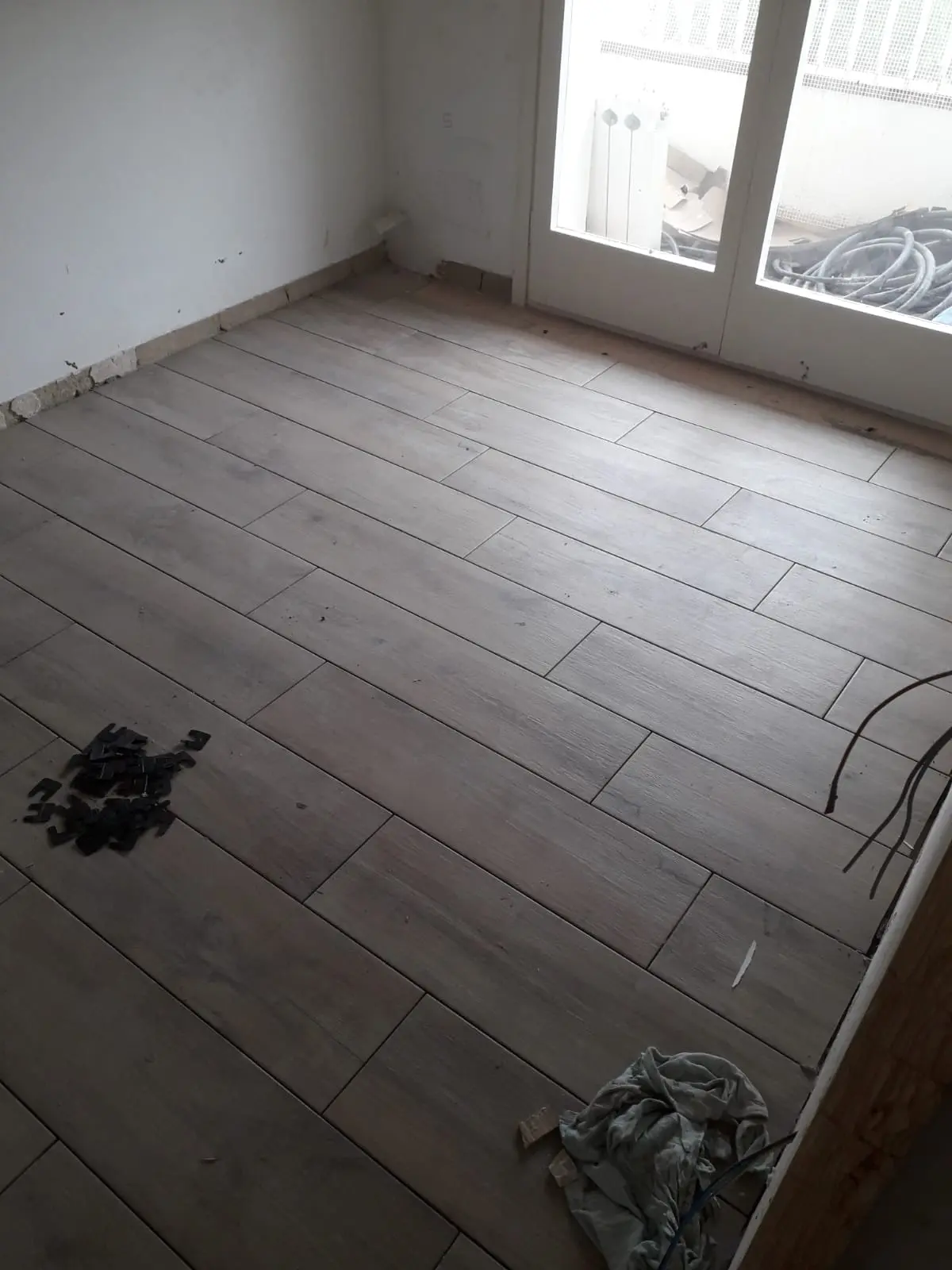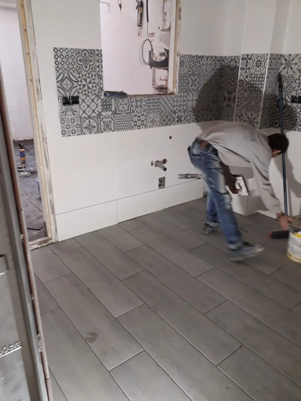 Proiect de amenajare completă a unei băi. Imaginile prezintă pereții placați cu faianță albă și o zonă de accent cu plăci decorative (tip patchwork/hidraulice). Pardoseala este finisată cu gresie tip parchet de culoare gri. Se observă pregătirile pentru montarea obiectelor sanitare (racorduri apă/scurgere) și instalația electrică nouă. Designul este modern și funcțional.