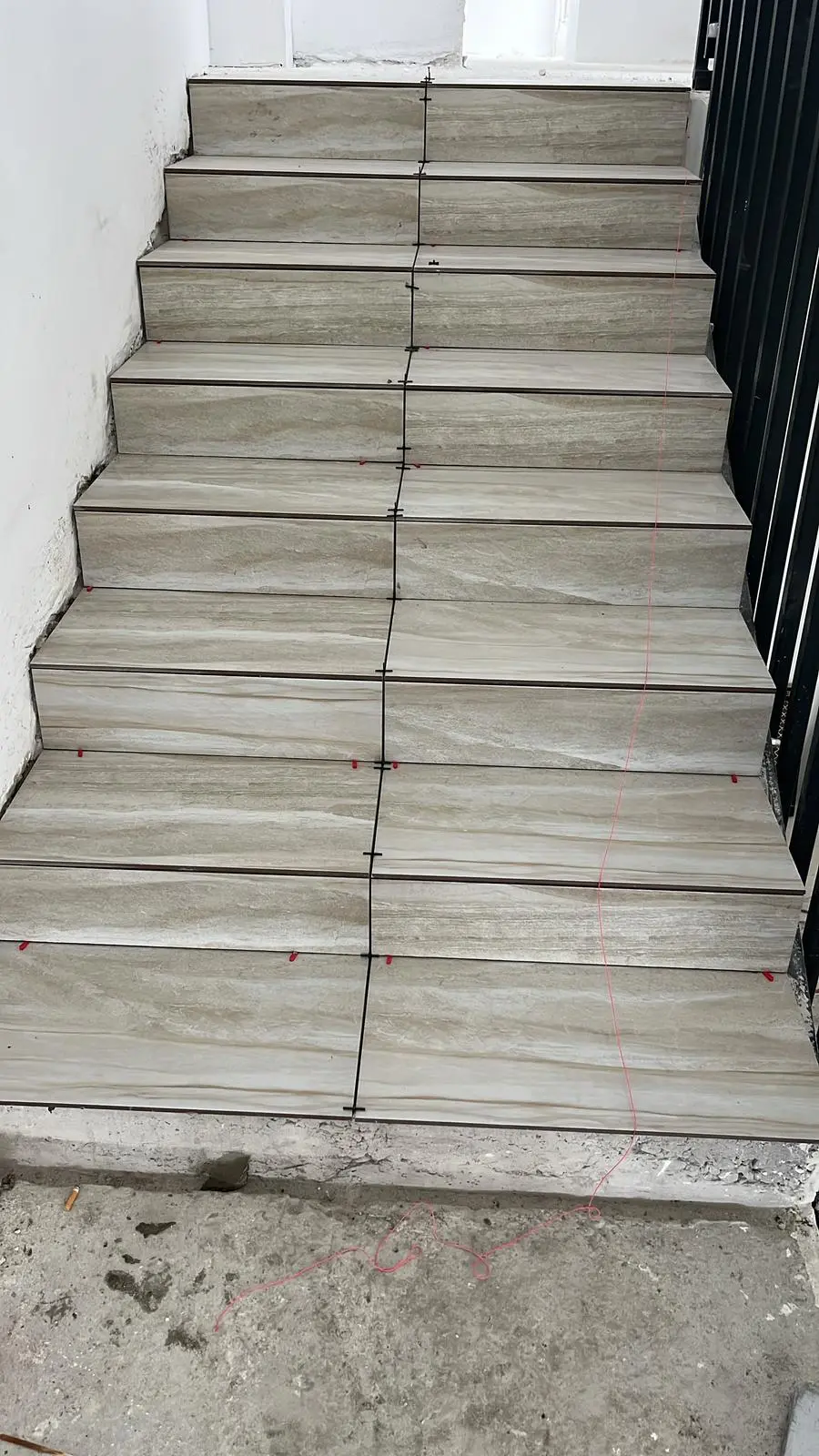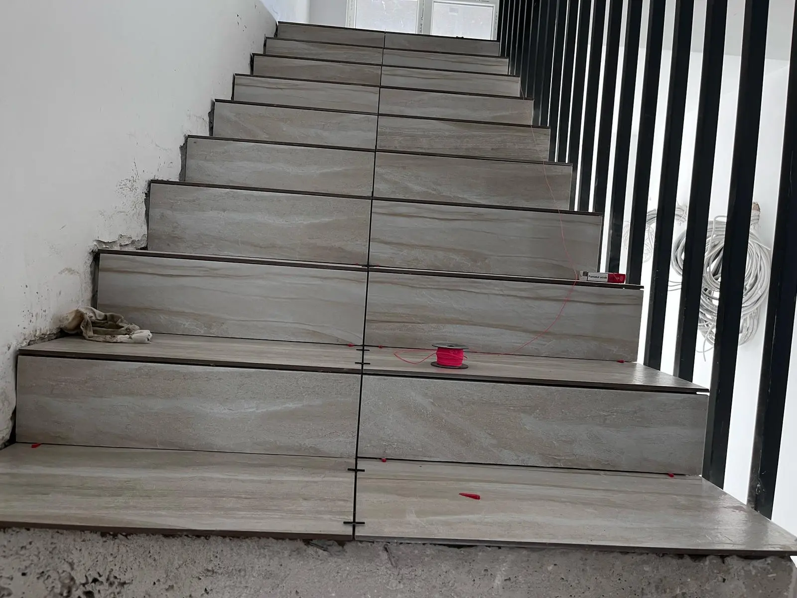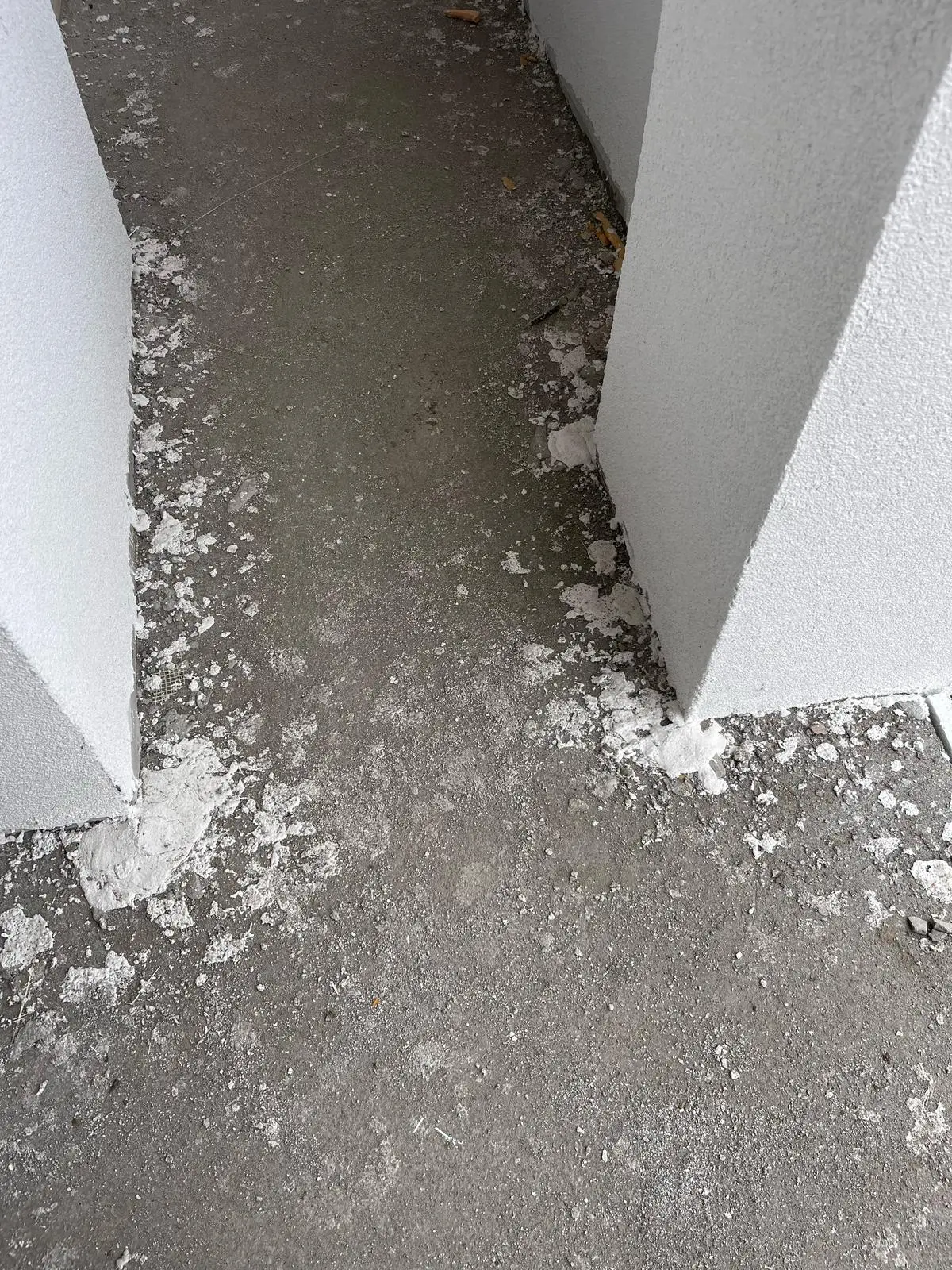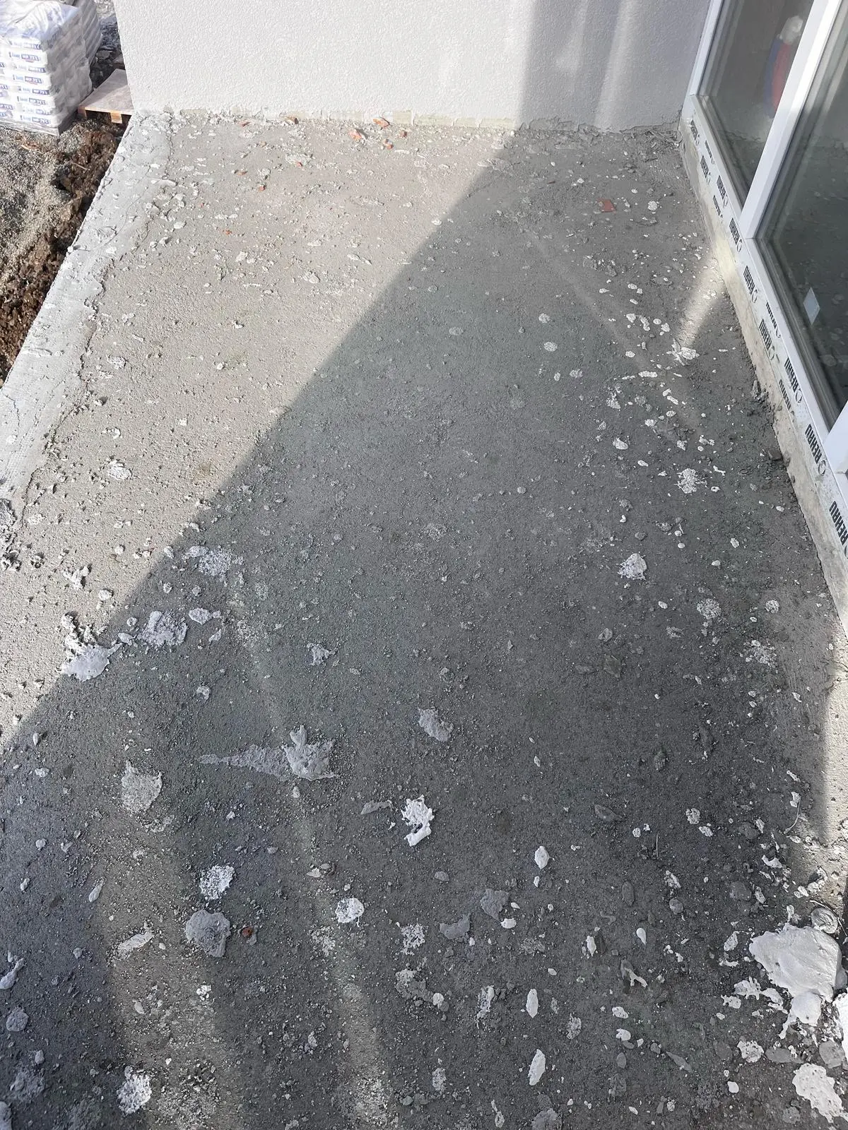 Lucrare de pavare a unei zone exterioare adiacente clădirii. S-au utilizat dale de pavaj din beton vibropresat, de culoare gri, montate pe un strat de nisip sau direct pe o șapă de beton. Imaginile prezintă suprafața pavată finalizată, cu rosturi uniforme, oferind un aspect curat și modern zonei de intrare sau terasei. Se observă integrarea cu fațada albă și tâmplăria modernă a clădirii.