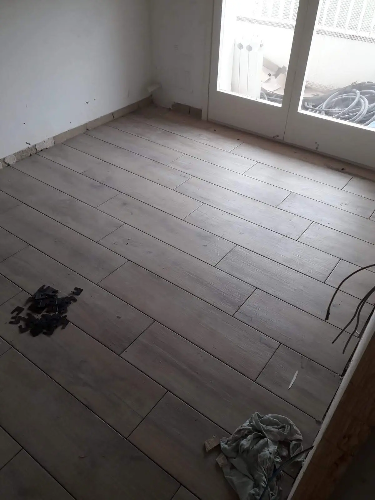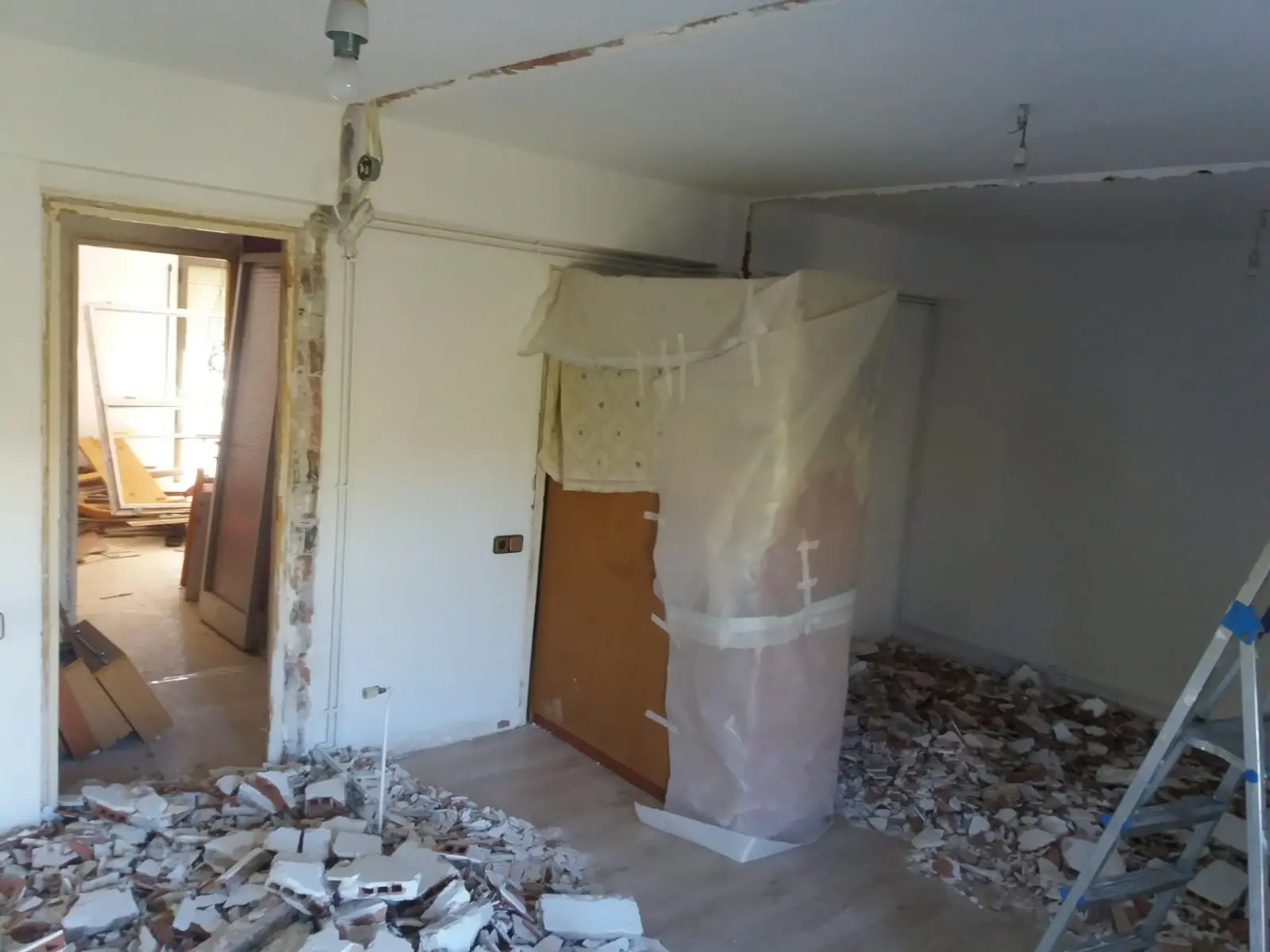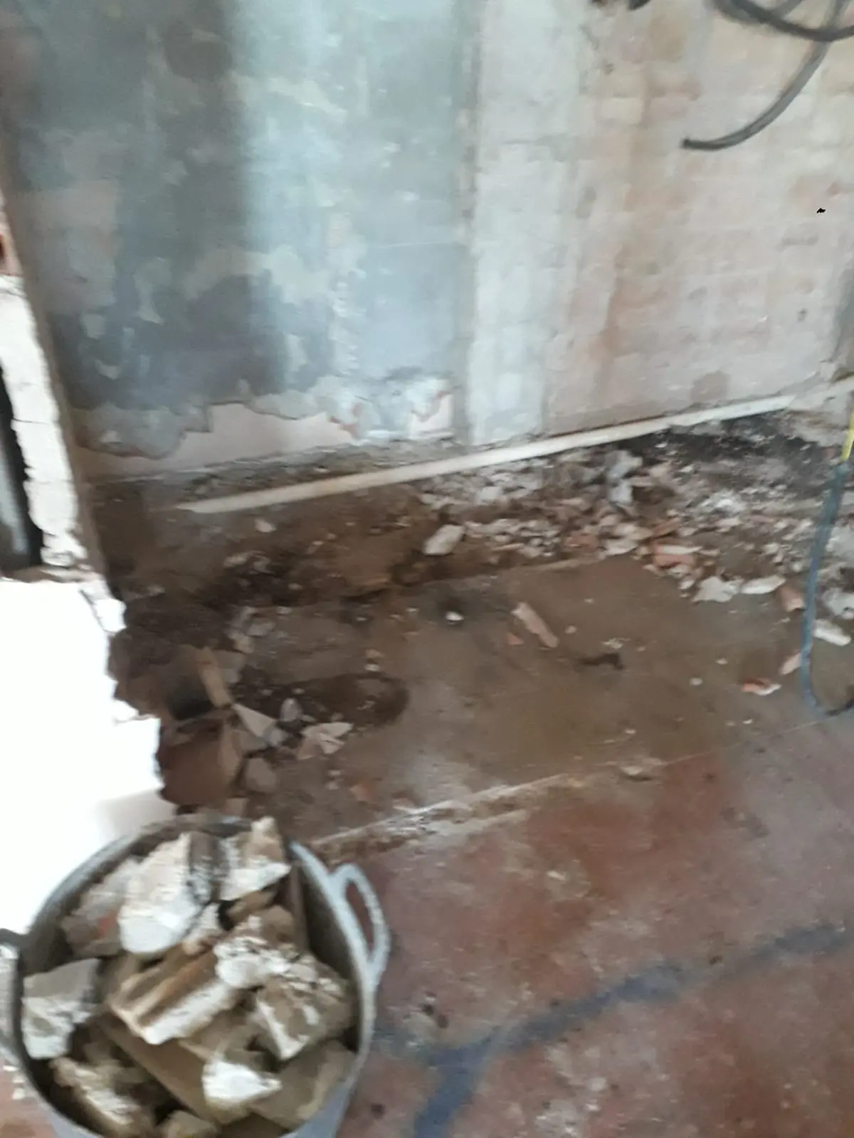 După finalizarea demolărilor, este esențială curățarea spațiului pentru a permite continuarea lucrărilor în condiții optime. Imaginile prezintă un muncitor utilizând unelte de curățenie (mătură, făraș) pentru a strânge resturile de materiale și molozul de pe pardoseală. Se observă containere sau găleți pregătite pentru colectarea și evacuarea deșeurilor.