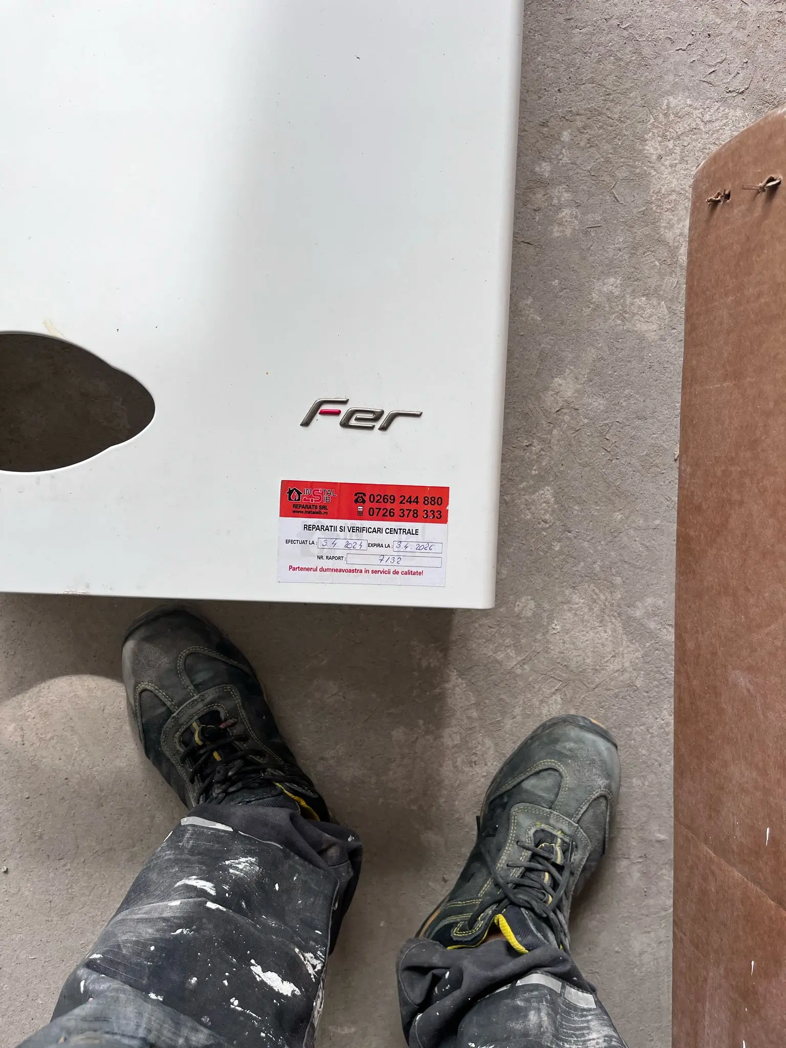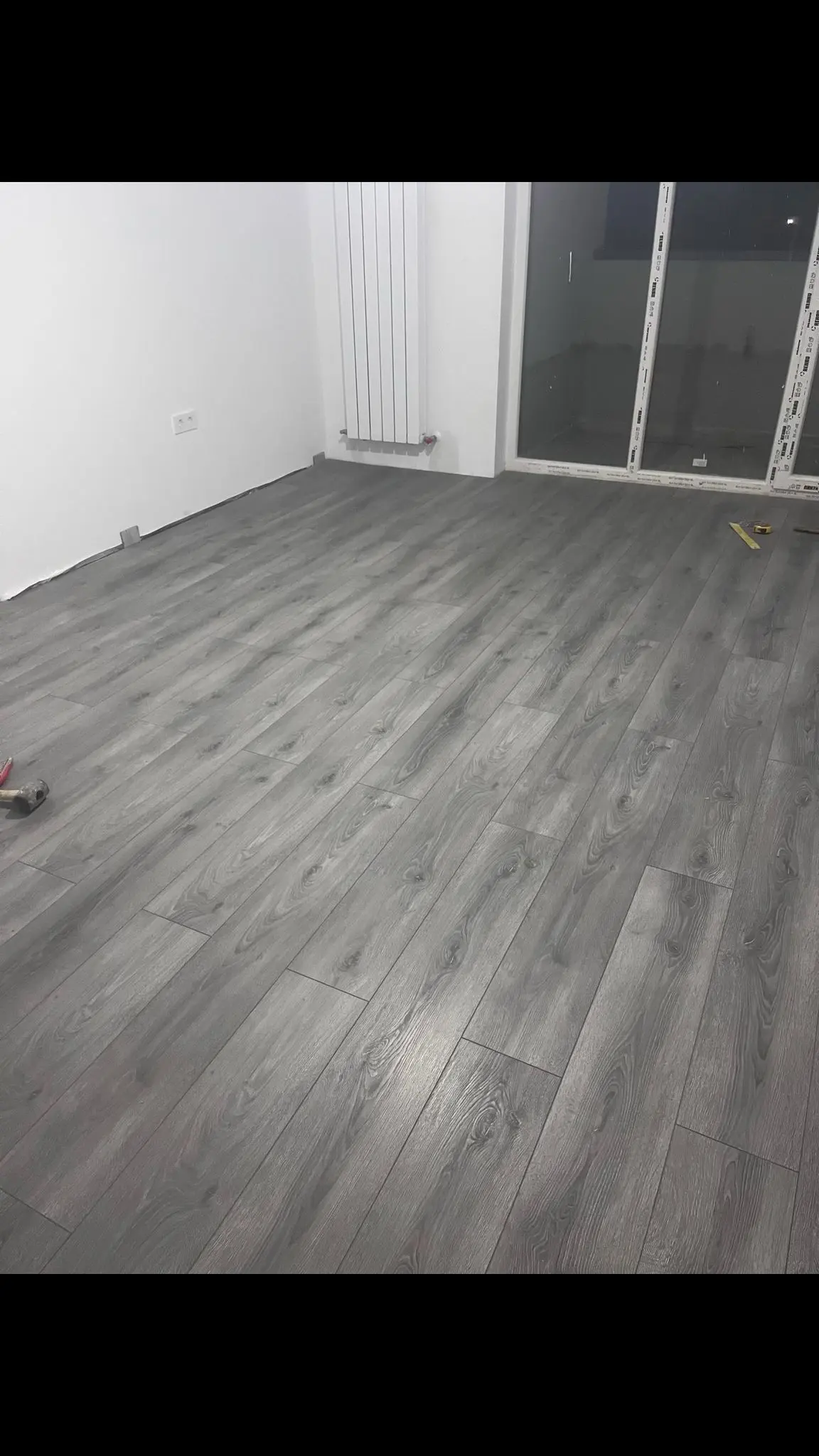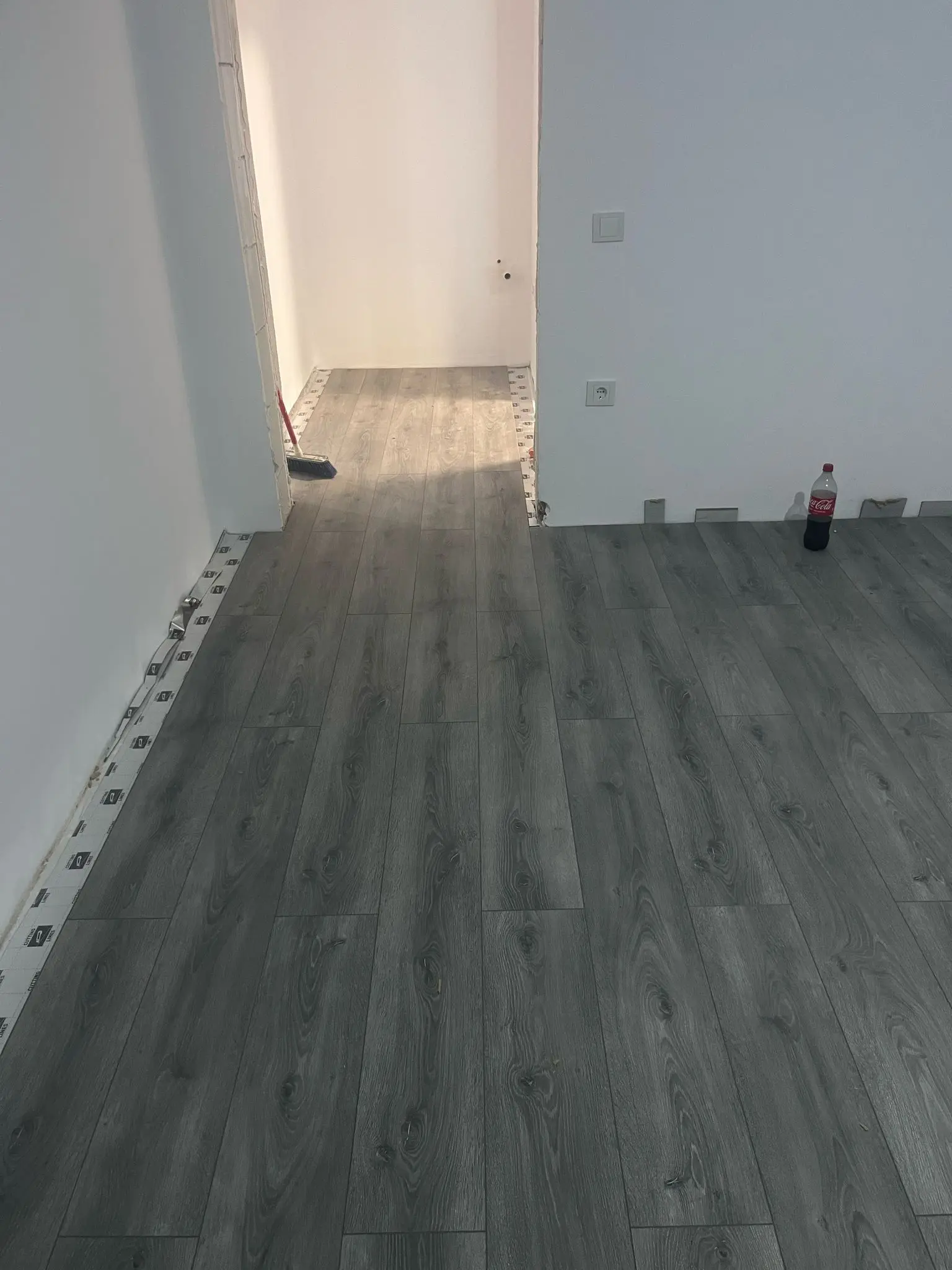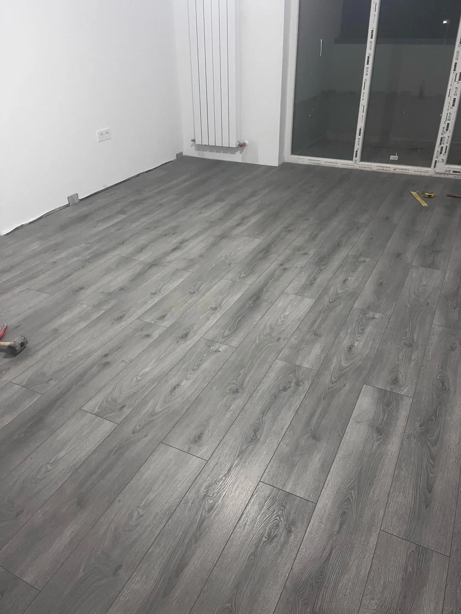 Colaj de imagini ce prezintă diferite aspecte ale amenajării unei băi contemporane. Se observă pereți placati cu faianță gri (posibil imitând piatra sau cimentul), montajul lavoarului tip bol pe un blat, bateria înaltă neagră, cabina de duș cu rigolă și bateria de duș neagră. Plafoniera LED asigură iluminatul. Imaginile surprind atât ansamblul, cât și detalii ale finisajelor și obiectelor sanitare.