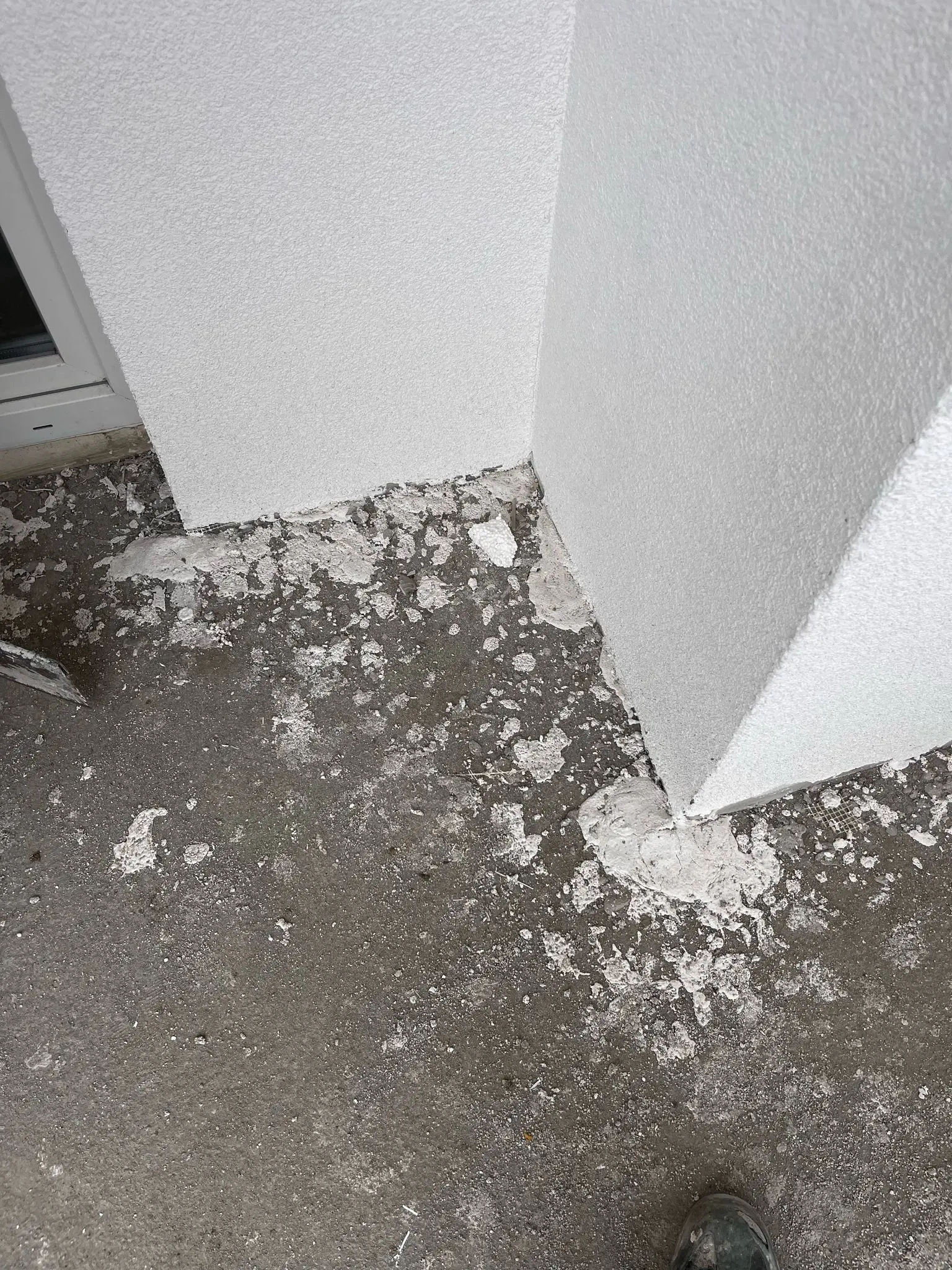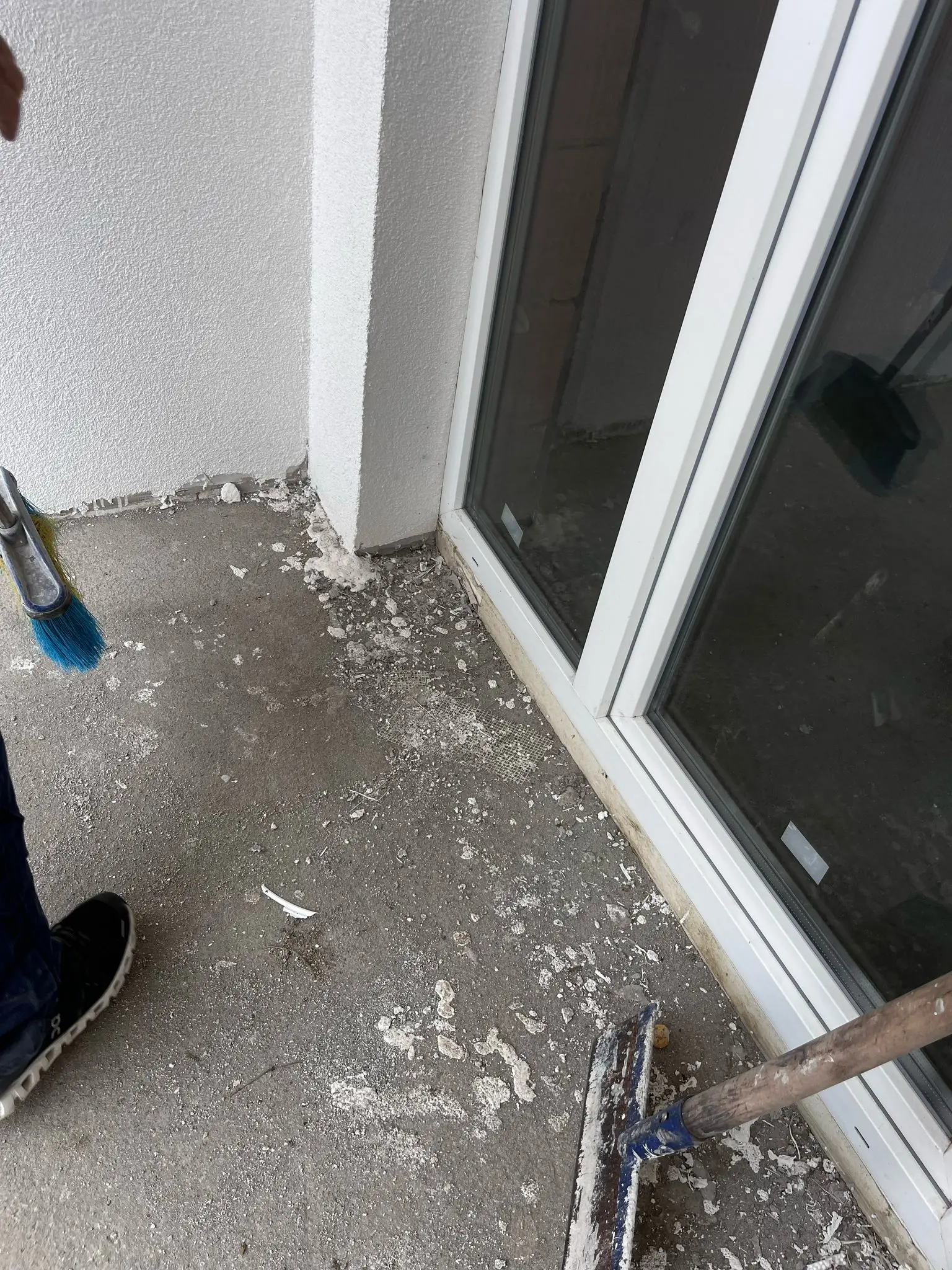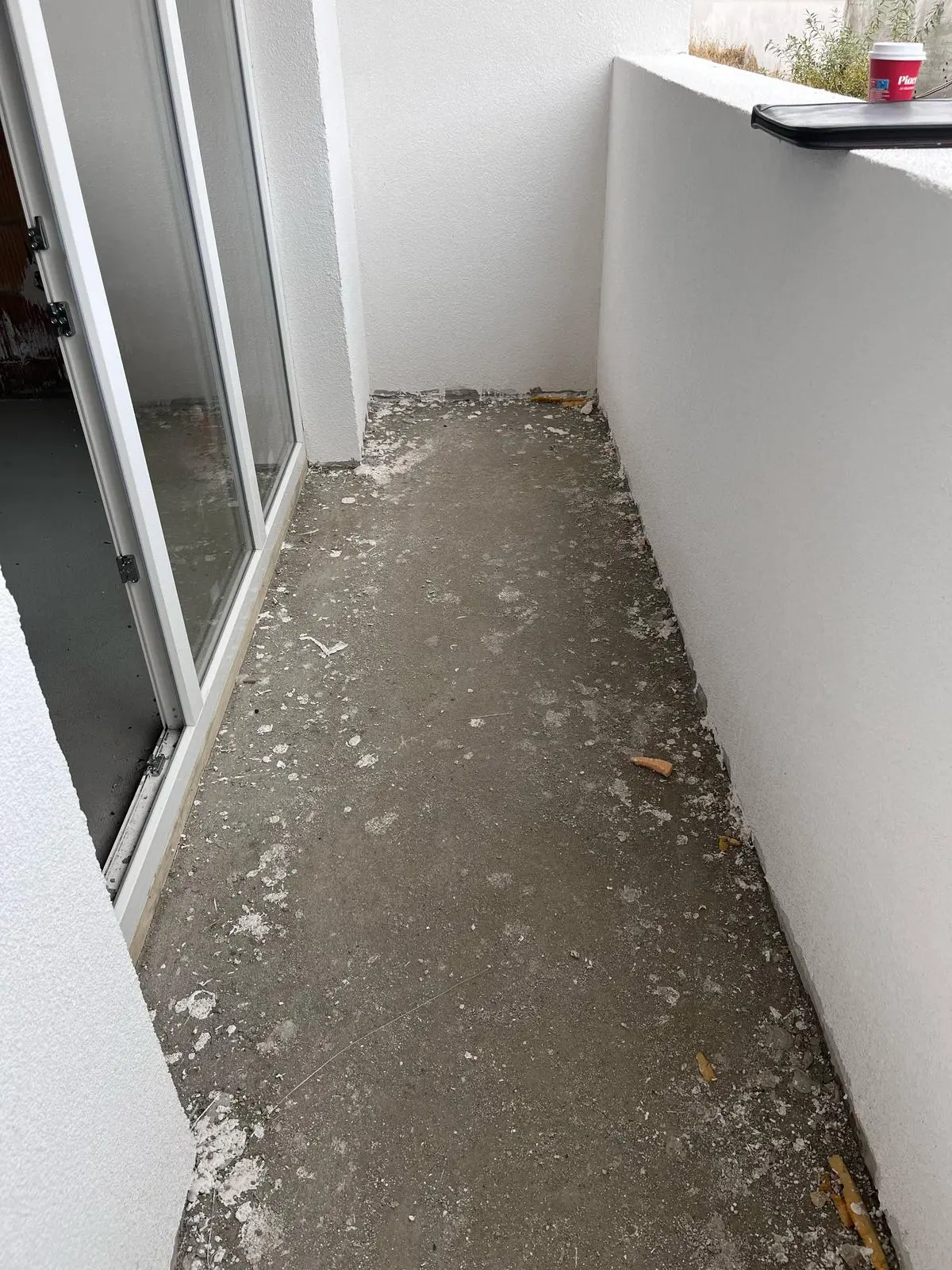 Imagine a unei bucătării în faza finală de amenajare. Se observă mobilierul modern cu fronturi gri mat, montat. Blatul de lucru și peretele dintre blat și corpurile suspendate (brâul) sunt realizate dintr-un material compozit sau ceramic cu aspect de marmură albă cu venaturi gri. Chiuveta și bateria sunt negre, completând designul. Electrocasnicele (plită, hotă, cuptor) sunt incorporate. O scară indică faptul că lucrările pot fi încă în desfășurare (ex. montaj final hotă sau iluminat).