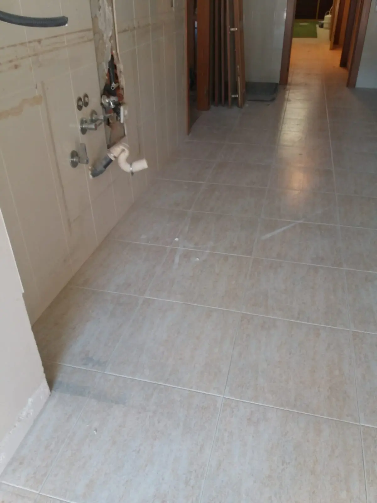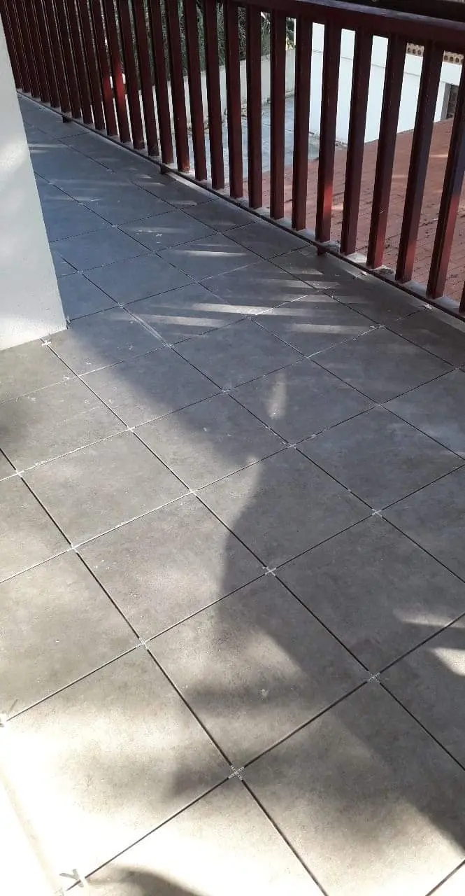 Lucrare de placare a pardoselii cu gresie porțelanată. S-a aplicat adezivul în strat uniform, folosind gletiera zimțată corespunzătoare dimensiunii plăcilor. Imaginea principală detaliază aplicarea adezivului prin metoda dublei aplicări (pe suport și pe placă) pentru a garanta o acoperire de 100% și aderență maximă. S-au utilizat cleme și pene de nivelare pentru a asigura o suprafață perfect plană și rosturi constante între plăci.