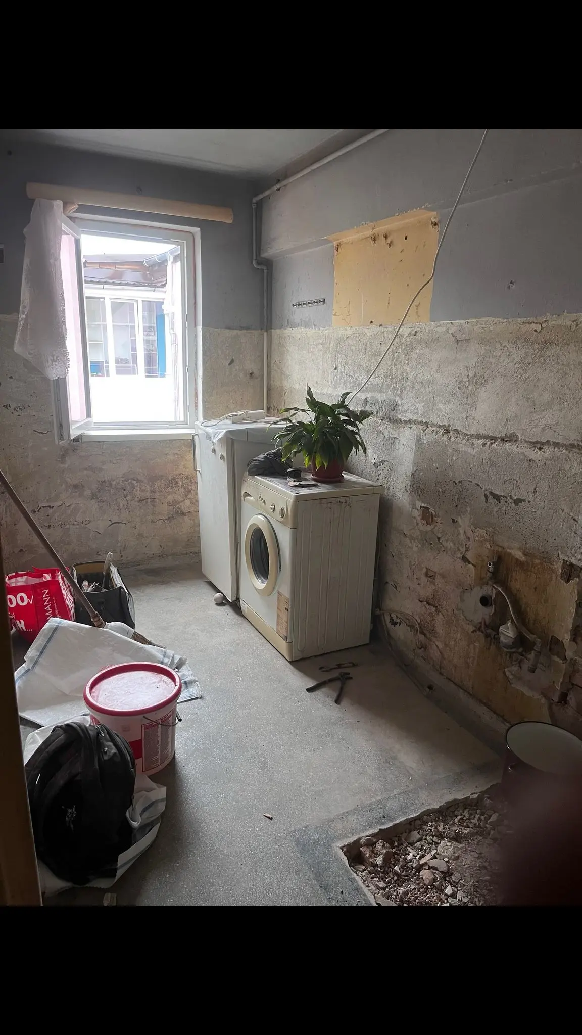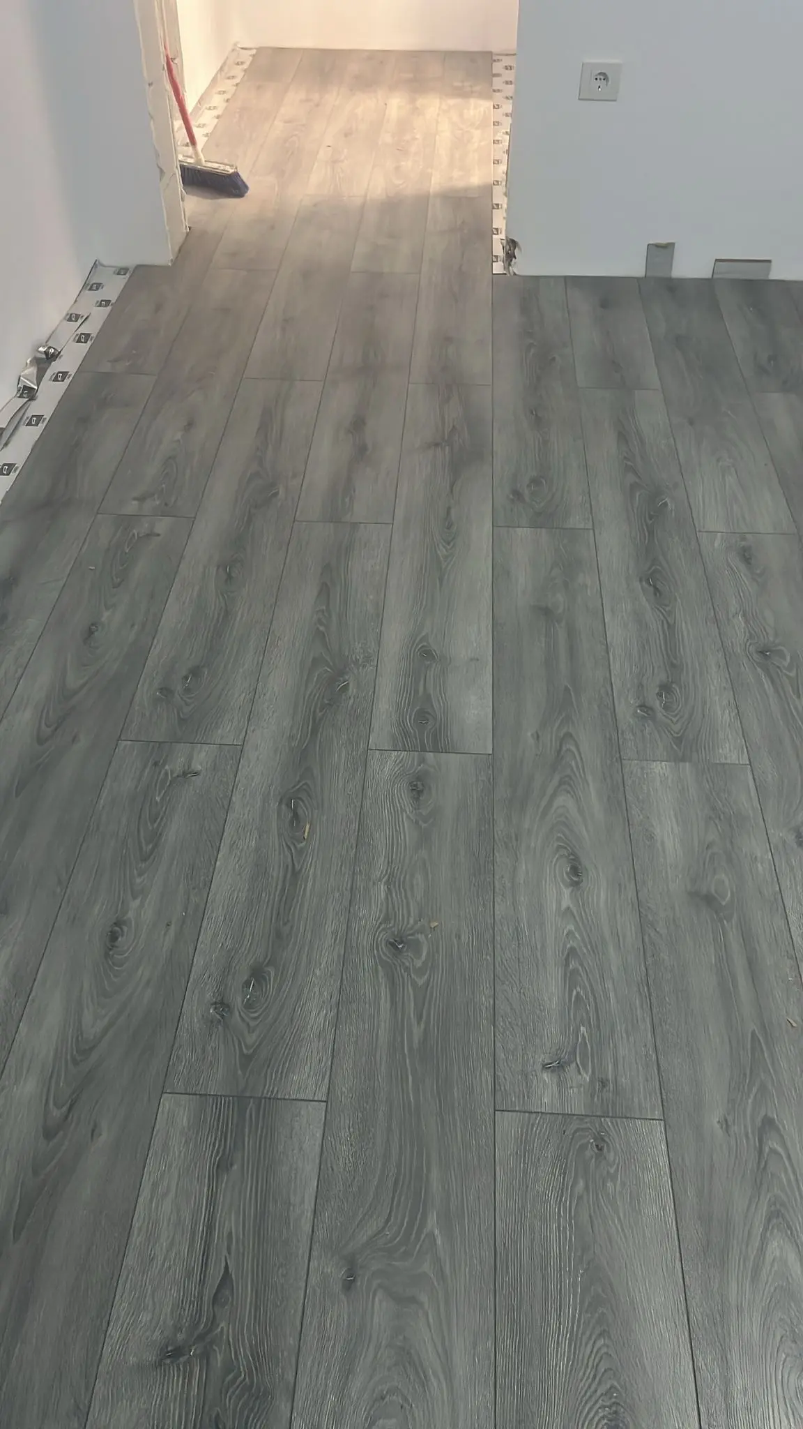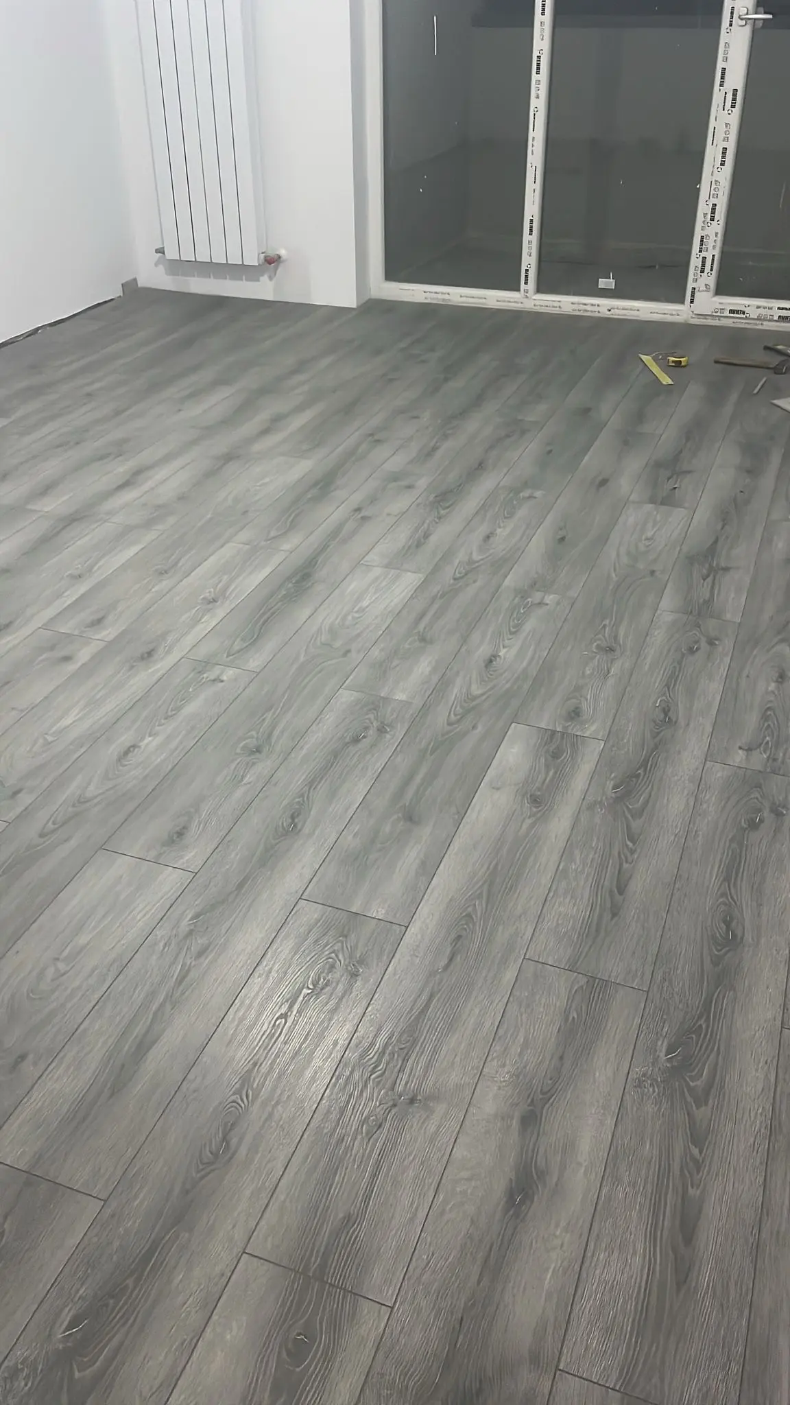 Imagini ce ilustrează procesul de placare a unei scări interioare, posibil din beton. Se utilizează plăci de gresie (în acest caz, cu aspect de piatră sau travertin) tăiate la dimensiune. Se observă aplicarea adezivului, așezarea plăcilor pe treaptă și contratreaptă și utilizarea distanțierilor pentru a asigura rosturi constante. Este vizibilă și balustrada metalică neagră a scării.