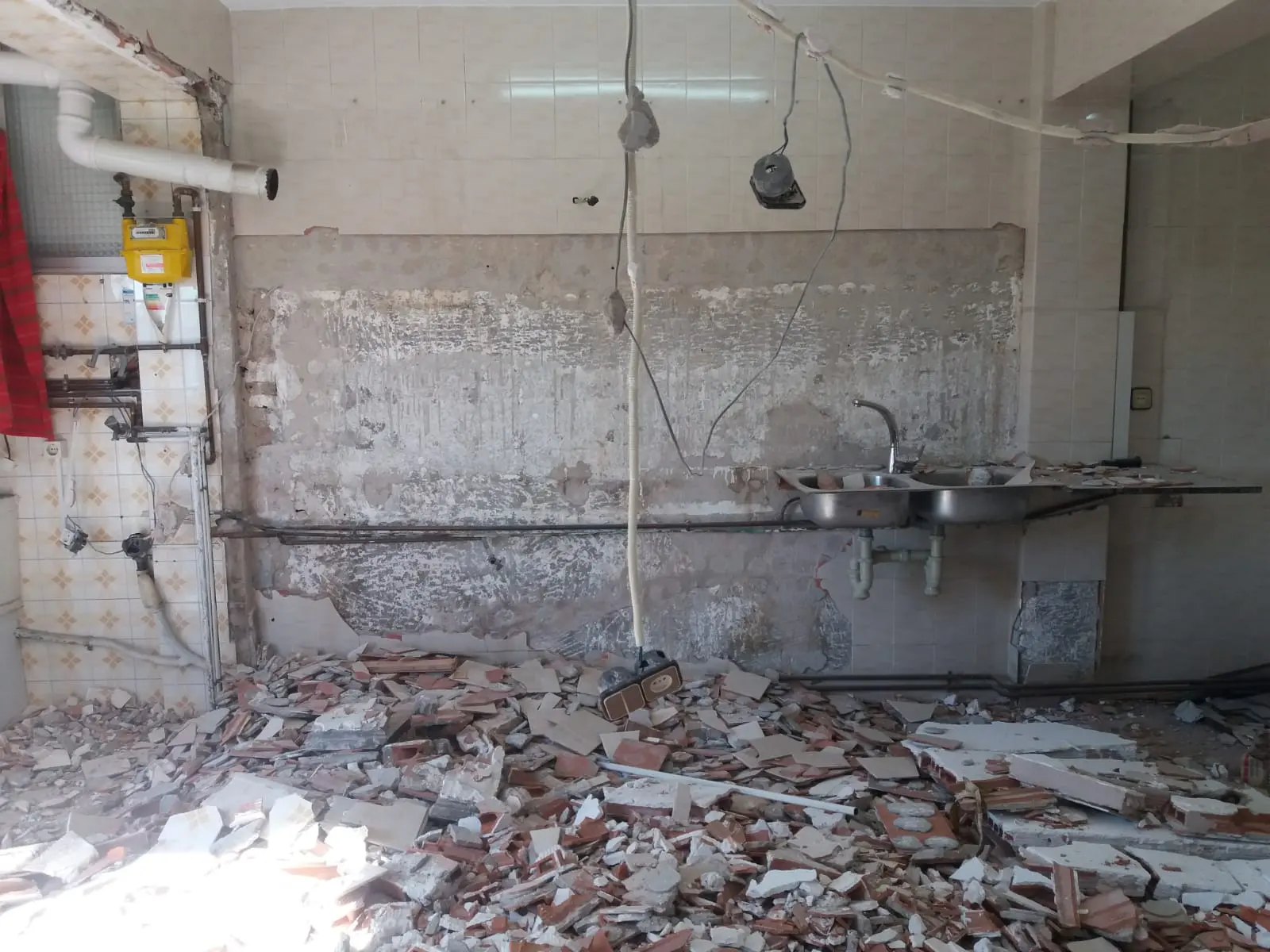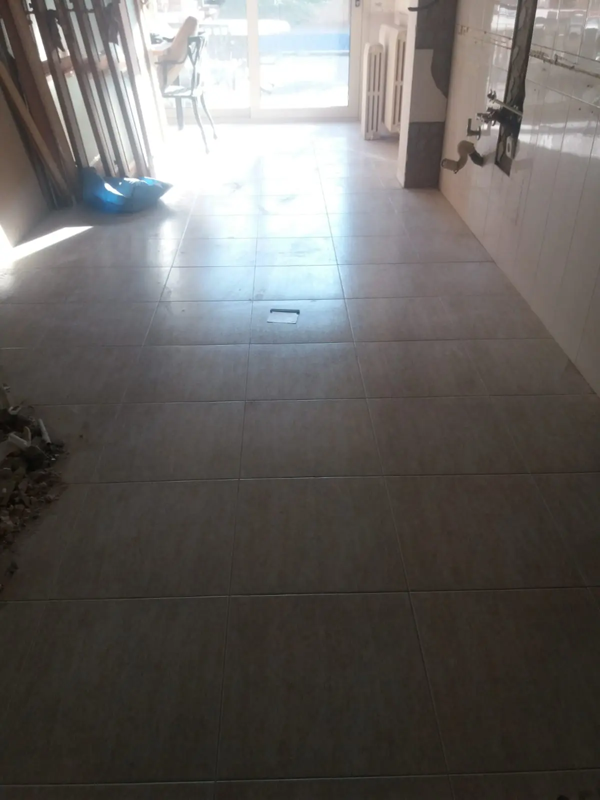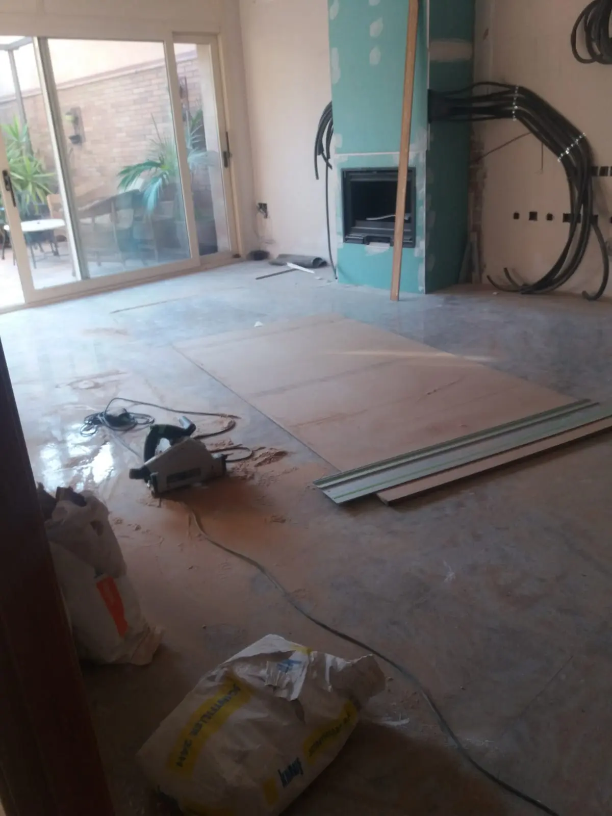 Proiect de reamenajare a zonei de zi. După finalizarea lucrărilor de infrastructură (electrice, posibil și pereți), s-a montat o pardoseală nouă, probabil gresie tip parchet sau parchet laminat. Imaginile arată spațiul cu pardoseala finalizată, gata pentru montajul mobilierului și a corpurilor de iluminat. Se observă prezența uneltelor și a materialelor specifice fazei de finisare.