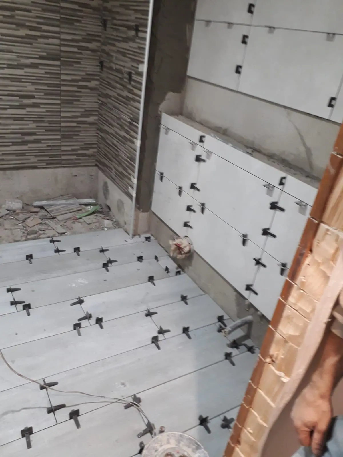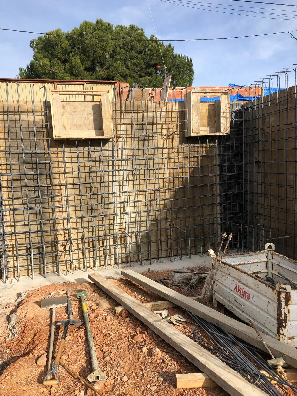 Vedere generală a unui șantier de construcții unde se realizează structura de rezistență a unei clădiri (posibil subsol și parter). Se observă pereți din beton armat turnați, cofraje (din lemn sau metalice) montate pentru elementele verticale (stâlpi, pereți) și orizontale (grinzi, planșee), armături pregătite pentru turnare și materiale de construcții depozitate. Imaginea ilustrează complexitatea și organizarea necesară într-un proiect de construcție structurală.