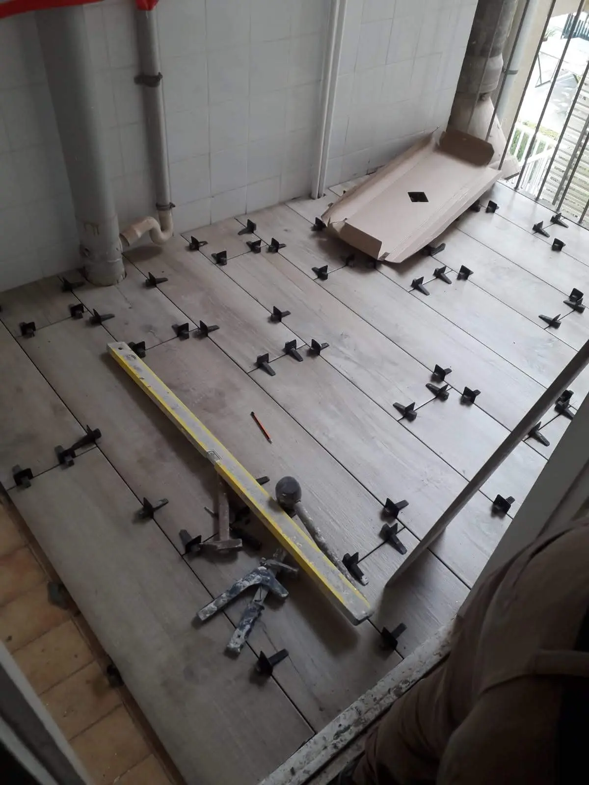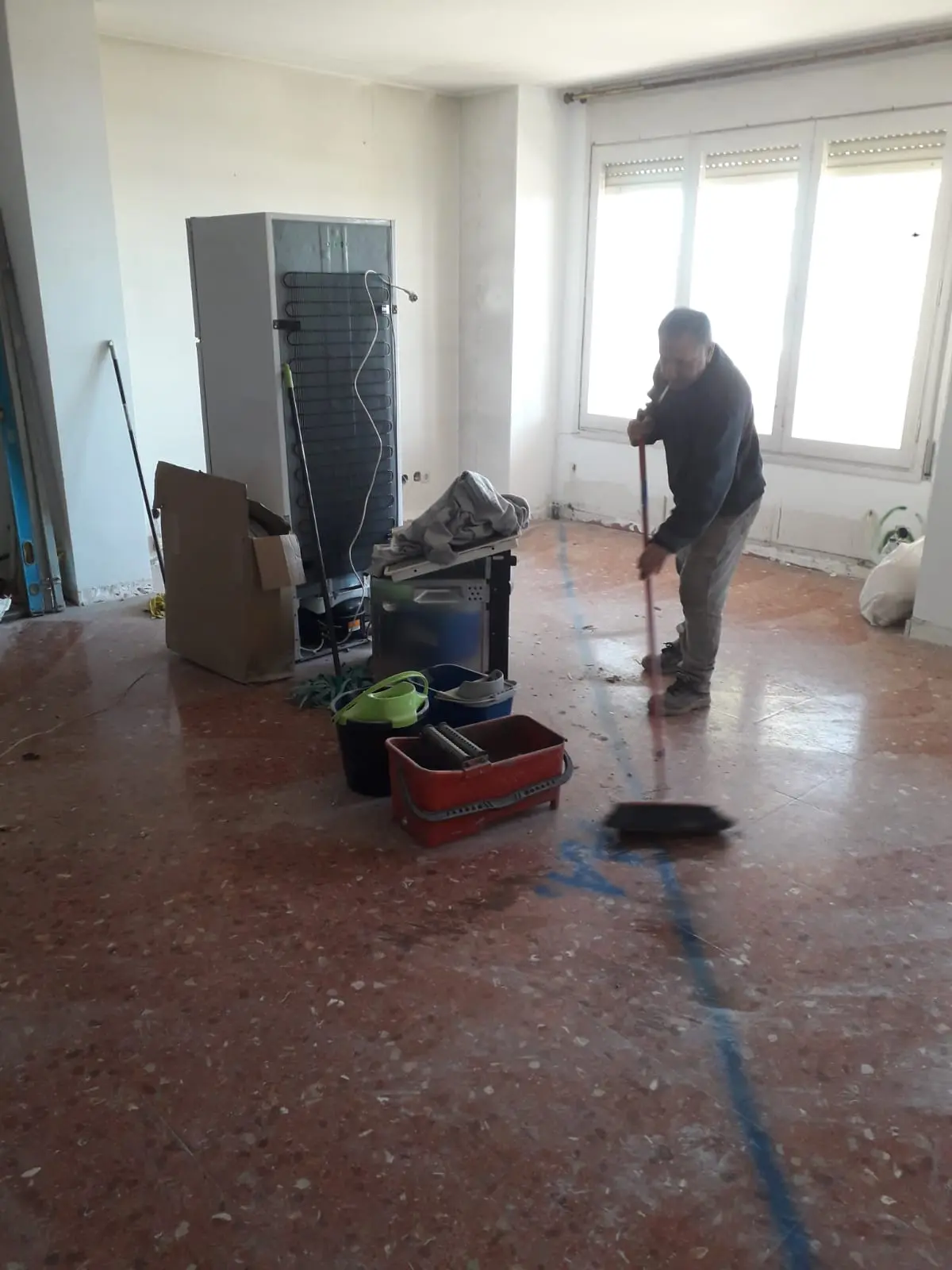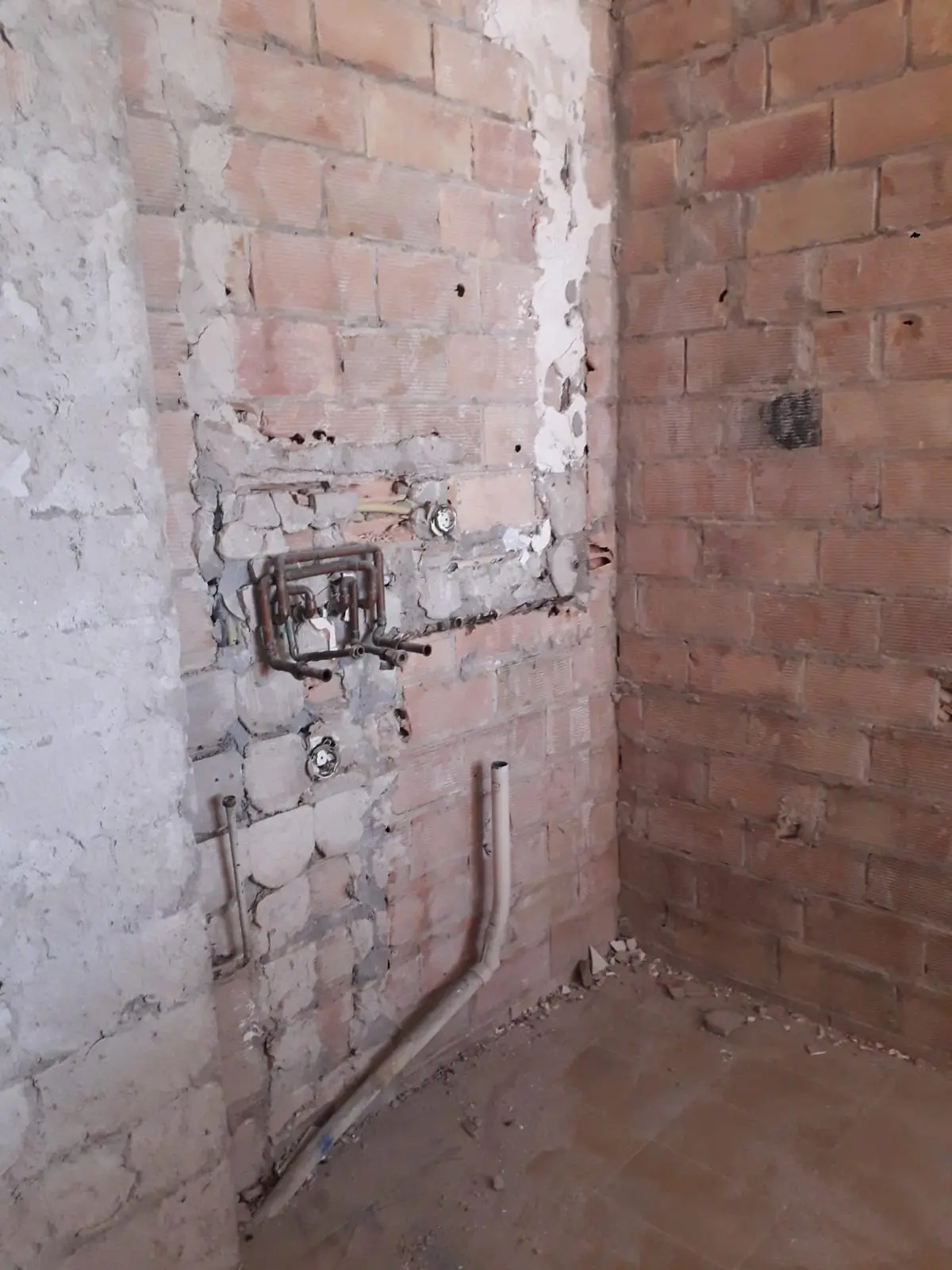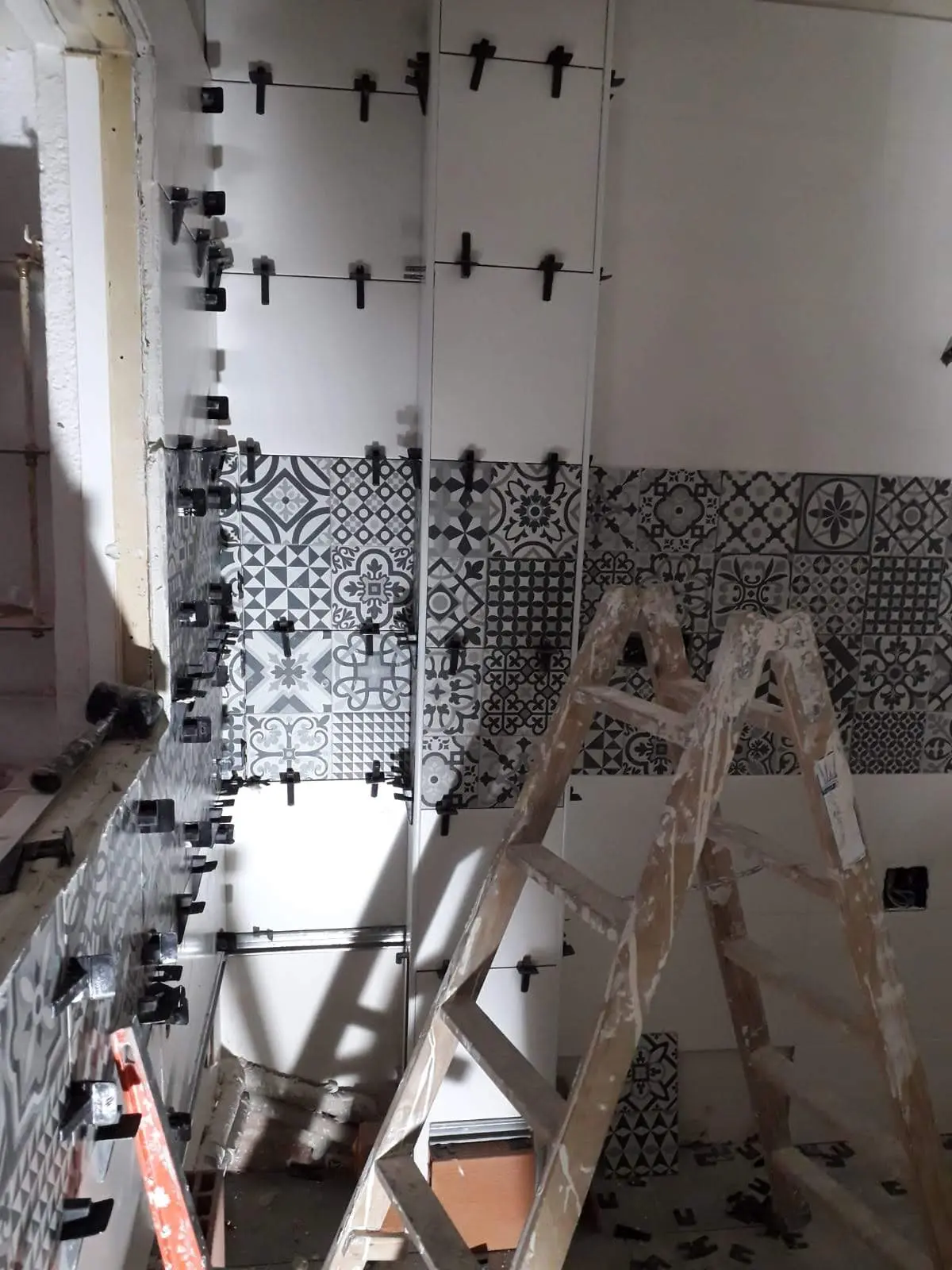 Ilustrarea unui spațiu interior, posibil o fostă baie sau bucătărie, utilizat temporar ca zonă tehnică sau spălătorie pe durata renovării. Se observă o mașină de spălat funcțională, conectată la instalații provizorii, alături de alte elemente specifice unui șantier (materiale depozitate, unelte). Reflectă adaptabilitatea necesară în gestionarea unui proiect de renovare.